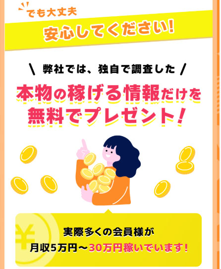 記載があるのは「30万円が稼げる」「誰でも稼げる」「主婦でも稼げる」など、とりあえず稼げるという点がゴリ押ししてあるというイメージ。