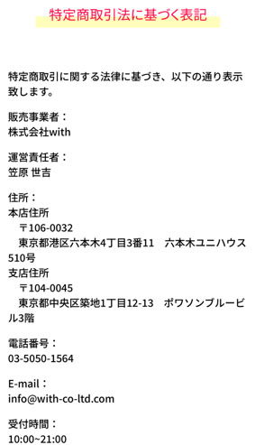 特商法表記の記載もありましたので、運営会社ははっきりしているようです。